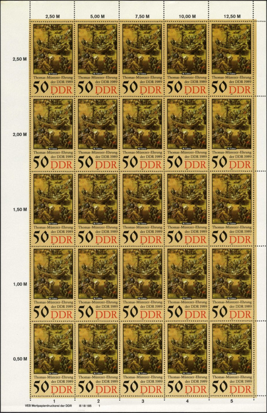 | Ersttag: | 22.8.1989 | Abbildung: | Müntzer in der Schlacht | Zähnung: | K14 | Druck: | Odr. | Farbe: | mehrfarbig | Wz: | ohne | Auflage: | 16.400.000 |