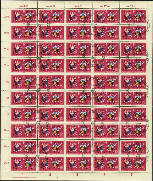 (Zuschlag) | | Ersttag: | 25.5.1961 | | Abbildung: | Junge Pioniere beim Volkstanz | | Zähnung: | K13:12½ | | Druck: | Odr. | | Farbe: | mehrfarbig | | Wz: | 3Y (DDR Kreuzblüten)