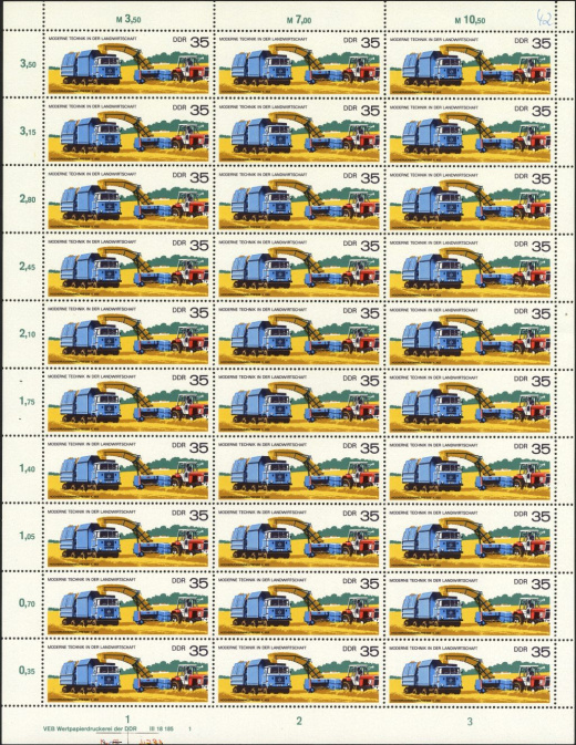 | | Ersttag: | 12.7.1977 | | Abbildung: | Düngestreuer DO 32/N auf LKW W 50 | | Zähnung: | K13:12½ | | Druck: | Odr. | | Farbe: | mehrfarbig | | Auflage: | 8.100.000 |
