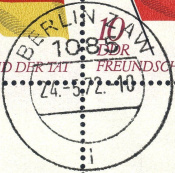 | Nummer: | | TE | | Typ: | Ersttagsstempel (EST) | | Ort/PA: | BERLIN ZAW 1085 | | ub: | i | | Datum: | 24.-5.72.-10 | | Größe: | 29,1mm |