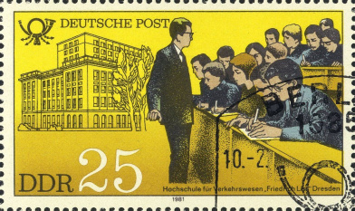 | | Ersttag: | 10.2.1981 | | Abbildung: | Hochschule für Verkerhswesen "Friedrich List", Dresden | | Zähnung: | K14 | | Druck: | Odr. | | Farbe: | mehrfarbig | | Wz: | ohne | | Auflage: | 2.000.000 |
