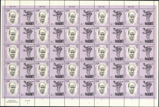 (Zuschlag) | | Ersttag: | 24.9.1963 | | Abbildung: | Ernst Grube (1890-1945) | | Zähnung: | K14 | | Druck: | RaTdr./StTdr. | | Farbe: | mattgraurot/schwarz | | Wz: | 3X (DDR und Kreuzblüten)