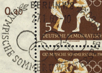 | | Ersttag: | 27.1.1960 | | Abbildung: | Kurzstreckenlauf | | Zähnung: | K13:13,5 | | Druck: | Odr. | | Farbe: | schwärzlichsmaragdgrün/dunkelchromgelb | | Wz: | 3Y (DDR Kreuzblüten)