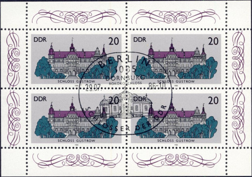 | Ersttag: | 29.6.1986 | Abbildung: | Schloss Güstrow | Zähnung: | K13:12,5 | Druck: | Odr. | Farbe: | mehrfarbig | Wz: | ohne | Auflage: | 16.400.000 |