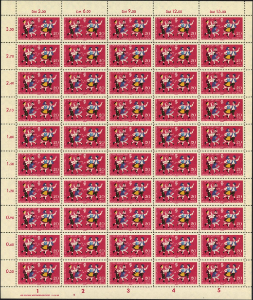 • Passerkreuz (PK): Im oberen Bogenrand über Feld 2/3. Im unteren Bogenrand nur ein vereinzelter blauer Strich unter Feld 47/48. Teil eines PK?