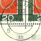 | Nummer: | | TS | | Typ: | Tagesstempel (ST) | | Ort/PA: | BERLIN 2, 102 | | ub: | ab | | Datum: | 31.7.69.-10 | | Größe: | 29,0mm |
