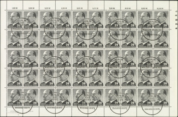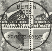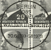 | Nummer: | | SE | | Typ: | Ersttagssonderstempel (ESST) | | Ort/PA: | BERLIN 1085 | | Inschrift: | WALTER ULBRICHT / 30.6.1893-1.8.1973 | | Datum: | 8.8.1973 | | Größe: | 36,3mm |