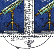 | | Ersttag: | 24.10.1978 | | Abbildung: | Gregoreanisches Tisch-Spiegel- Teleskop (Löser-Werkstatt von Schloss Reinharz, um 1750) | | Zähnung: | K14 | | Druck: | RaTdr. | | Farbe: | mehrfarbig | | Auflage: | 2.100.000 |