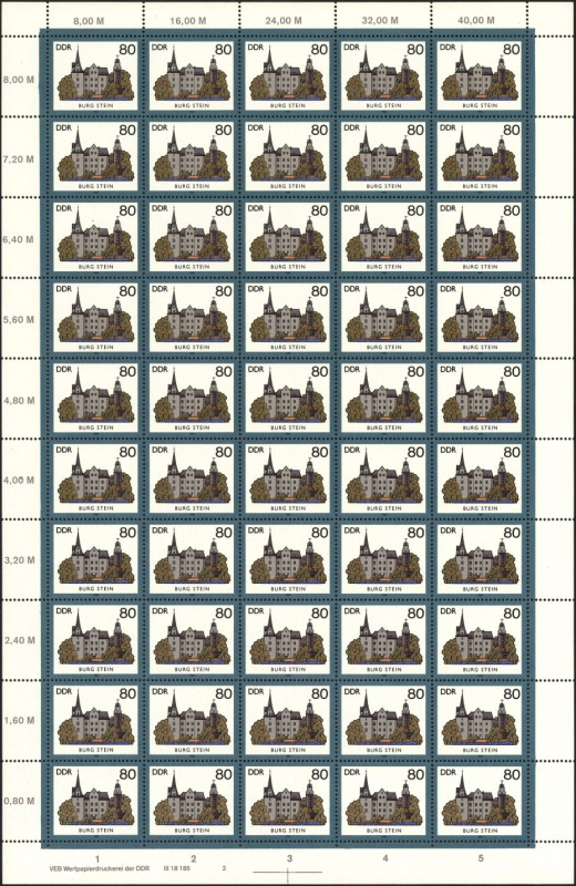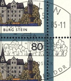 | | Ersttag: | 15.10.1985 | | Abbildung: | Burg Stein bei Zwickau (12./13. Jh.) | | Zähnung: | K14 | | Druck: | Odr. | | Farbe: | mehrfarbig | | Auflage: | 2.100.000 |