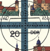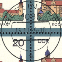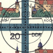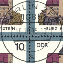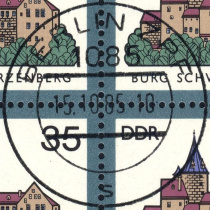 | Nummer: | | SE | | Typ: | Ersttagssonderstempel (ESST) | | Ort/PA: | BERLIN 1085 | | Inschrift: | BURGEN IN DER DDR | | Abbildung: | Burg Goseck | | Datum: | 15.10.85-11 | | Größe: | 34,4mm x 39,1mm |