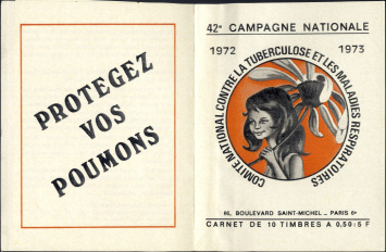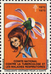 | KatNr.: | | FR-1972-1 (Green: 56) | | Abbildung: | Mädchen mit Margerite(?) | | Schriftzug: | "1972 / 1973" (oben) "COMITE NATIONAL CONTRE LA TUBERCULOSE ET LES MALADIES RESPIRATOIRES" und "CINQUANTE CENTIMES POUR LA SANTÉ" (unten) | | Zähnung: | K13½:13¼ | | Druck: | RaTdr. | | Farben: | orange, braun, blau, gelb, rosa | | Wz: | WSM - | | Auflage: | ? |
