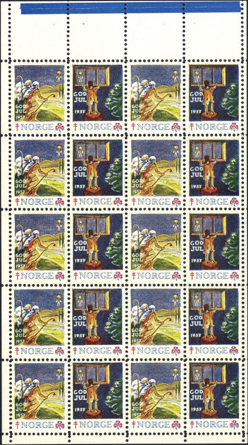 | KatNr.: | | NO-1957-1 (Green: 54.1) | | Abbildung: | Hirten blicken zum Weihnachtsstern | | Schriftzug: | "GOD JUL 1957" (oben), "NORGE" (unten) | | Zähnung: | L11 | | Druck: | Odr. | | Farben: | blau, gold, rot | | Auflage: | ? |