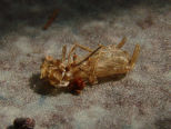 Abends: Das Heimchen von gestern hat sie schon verputzt! So sieht es jedenfalls aus... Es liegt tot vor der Spinne - sieht aber nicht so aus, als ob es ausgesaugt wurde. Na ja... erst frisst sie Tagelang gar nichts und dann zwei Heimchen in zwei Tagen! Ist das ein Anzeichen dafür, das sie sich bald häuten wird? |