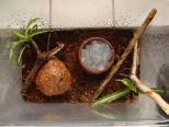 Abends: Man hat sich von der einen Ecke in die andere Ecke bewegt. Das eine Heimchen lebt immer noch. Habe das Terrarium in die Kücke gestellt.