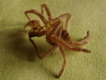 Morgends: Von den beiden Heimchen ist nur noch eines übrig. Das andere liegt als ausgesaugte Hülle in der Nähe der Spinne. Sie hockt zwischen Ast und Stein und lässt sich auch durch eine Berührung nicht zu einer Reaktion hinreißen. Na ja, wenn man verdaut liegt man halt erst einmal träge herum und will nicht gestört werden...
