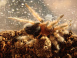 Nein, Scherz beiseitet... Auch so 'ne Vogelspinne braucht etwas Beachtung - schließlich soll sie ja mal handzahm werden. Also auch mal mit der Hand rein und ein bischen "kitzeln", damit sie sich an die Greifwerkzeuge des Menschen gewöhnt. Hoffentlich klappt das auch so, wie sich das meine Nachbarin so vorgestellt hat... |
