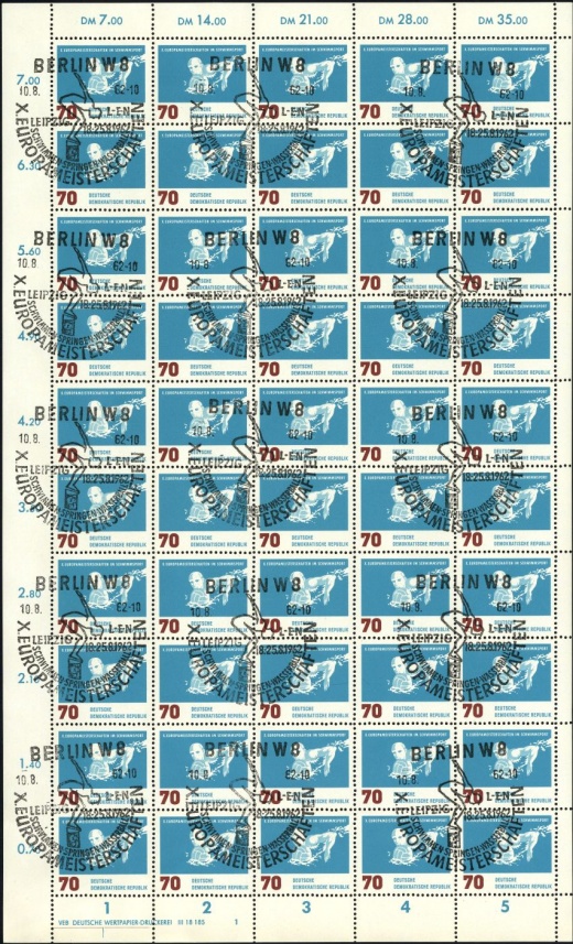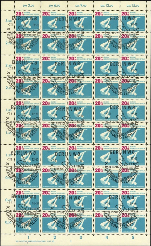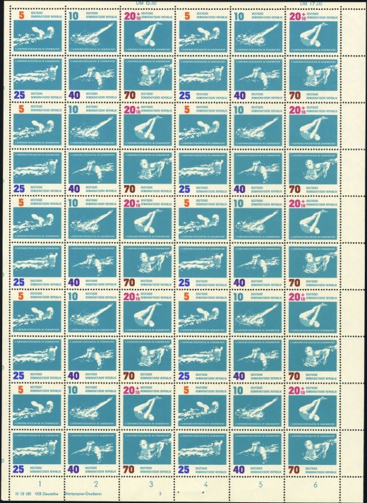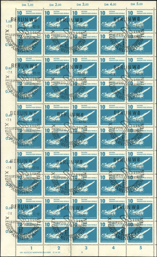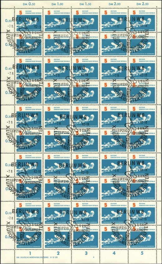 | | Ersttag: | 7.8.1962 | | Abbildung: | Brustschwimmen | | Zähnung: | K13:13,5 | | Druck: | Odr. | | Farbe: | lebhaftgrünblau/blauviolett | | Wz: | 3X (DDR und Kreuzblüten)