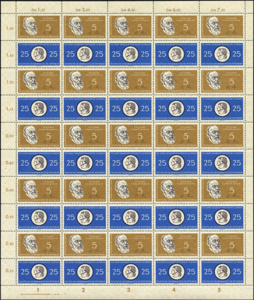 | | Ersttag: | 4.11.1960 | | Abbildung: | Vorderseite der Festplakette (Kopfbilder der Brüder Wilhelm und Alexander von Humboldt) | | Zähnung: | K13:12,5 | | Druck: | Odr. | | Farbe: | cyanblau/braunschwarz | | Wz: | 3Y (DDR Kreuzblüten)