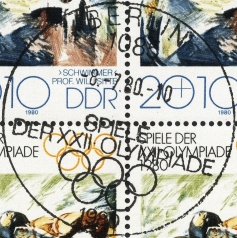 (Zuschlag) | Ersttag: | 8.7.1980 | Abbildung: | Schwimmer; Ölgemälde von Willi Sitte (1921-2013) | Zähnung: | K14 | Druck: | RaTdr. | Farbe: | mehrfarbig | Auflage: | 3.000.000 |