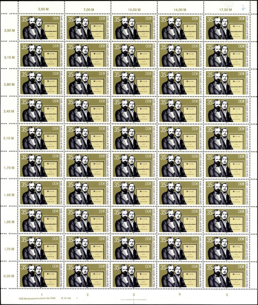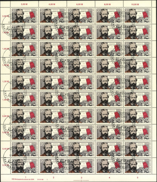 | | Ersttag: | 11.4.1983 | | Abbildung: | Karl Marx und Friedrich Engels, Titelblatt "Minifest der Kommunistischen Partei" | | Druck: | Odr. | | Farbe: | mehrfarbig | | Auflage: | 5.000.000 |