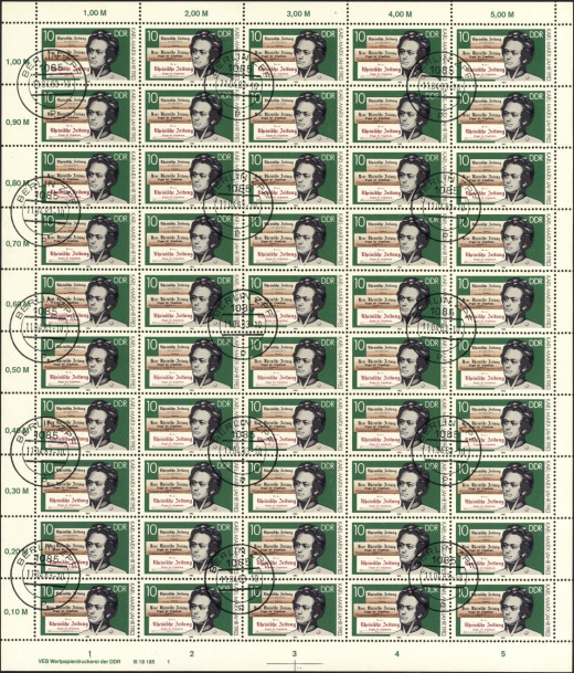 | | Ersttag: | 11.4.1983 | | Abbildung: | Karl Marx, Aufstand der Seidenweber von Lyon (1831), Zeitschriftentitel | | Druck: | Odr. | | Farbe: | mehrfarbig | | Auflage: | 8.000.000 |