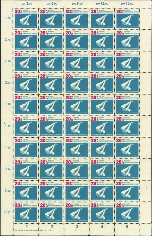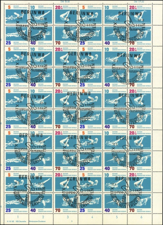 (Zuschlag) | | Ersttag: | 7.8.1962 | | Abbildung: | Wasserspringen | | Zähnung: | K13:13,5 | | Druck: | Odr. | | Farbe: | lebhaftgrünblau/karminlila | | Wz: | 3X (DDR und Kreuzblüten)