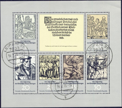 | KatNr.: | | 2013Zf (Michel) | | Ersttag: | 11.2.1975 | | Abbildung: | Titelblatt der 12 Artikel, die die Forderungen den Bauern enthalten | | Zähnung: | K12,5:13 | | Druck: | Odr. | | Farbe: | mehrfarbig | | Wz: | ohne | | Auflage: | 2.000.000 |