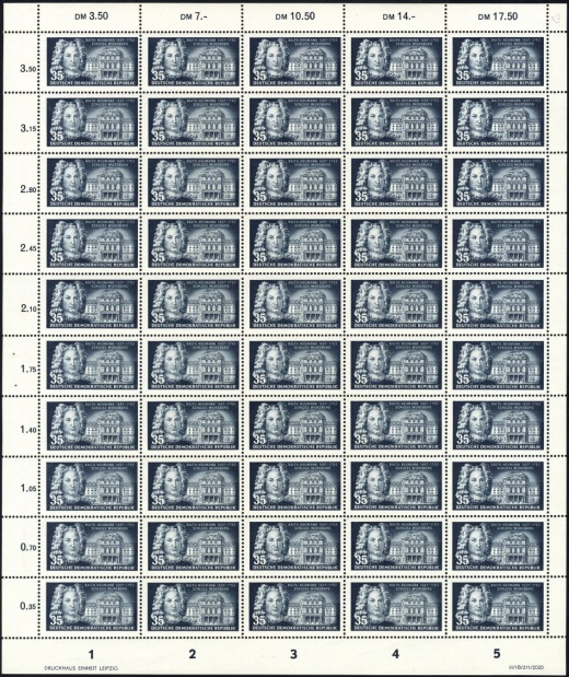 | | Ersttag: | 16.9.1953 | | Abbildung: | Balthasar Neumann, Residenz Würzburg | | Zähnung: | K13:12,5 | | Druck: | RaTdr. | | Farbe: | schwärzlichpreußischblau | | Wz: | 2 XI/XII | | Auflage: | 1.200.000 |