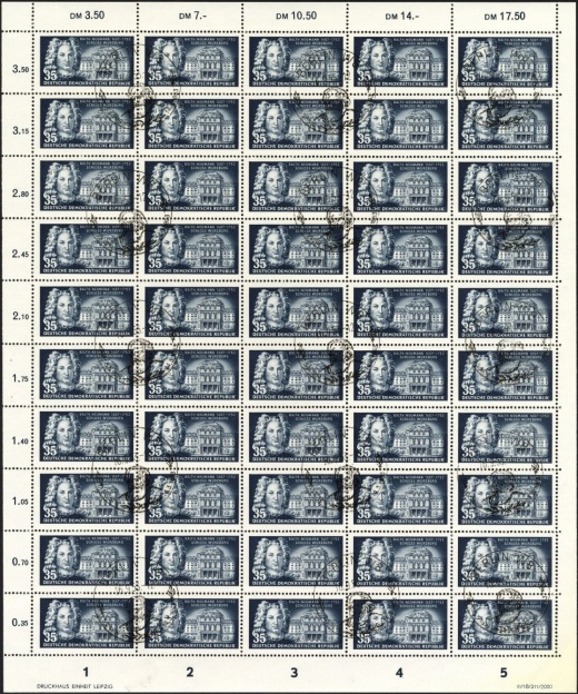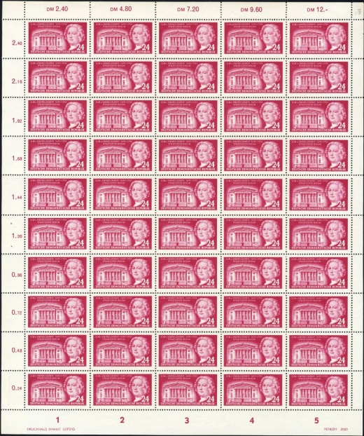 | | Ersttag: | 16.9.1953 | | Abbildung: | Balthasar Neumann, Residenz Würzburg | | Zähnung: | K13:12,5 | | Druck: | RaTdr. | | Farbe: | schwärzlichpreußischblau | | Wz: | 2 XI/XII | | Auflage: | 1.200.000 |