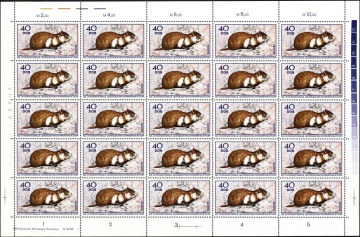 | | Ersttag: | 5.2.1970 | | Abbildung: | Nerz | | Zähnung: | K14 | | Druck: | RaTdr. | | Farbe: | mehrfarbig | | Wz: | ohne | | Auflage: | 1.700.000 |
