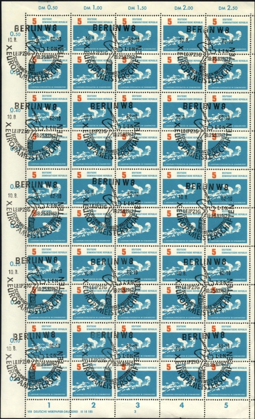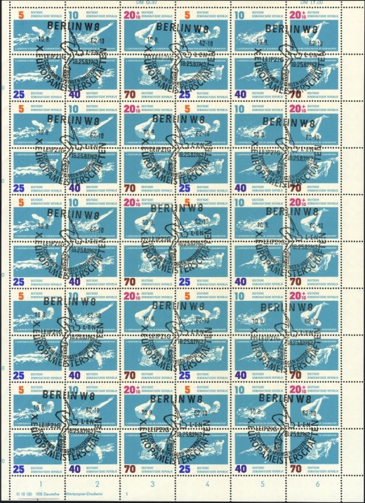 | | Ersttag: | 7.8.1962 | | Abbildung: | Brustschwimmen | | Zähnung: | K13:13,5 | | Druck: | Odr. | | Farbe: | lebhaftgrünblau/blauviolett | | Wz: | 3X (DDR und Kreuzblüten)