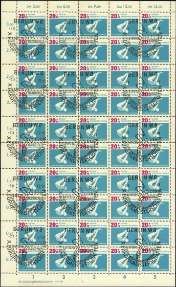 (Zuschlag) | | Ersttag: | 7.8.1962 | | Abbildung: | Wasserspringen | | Zähnung: | K13:13,5 | | Druck: | Odr. | | Farbe: | lebhaftgrünblau/karminlila | | Wz: | 3X (DDR und Kreuzblüten)