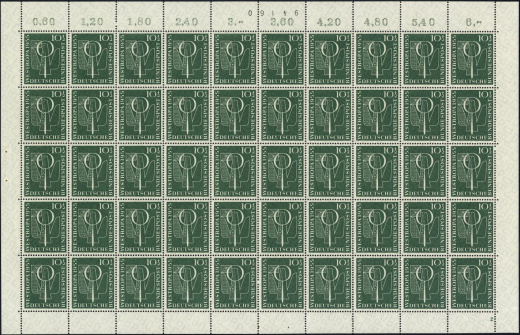 (Zuschlag) | | Ersttag: | 31.1.1951 | | Abbildung: | Stilisierte Brieftaube und Lupe | | Zähnung: | K13,75:14 | | Druck: | StTdr. | | Farbe: | dunkelrot | | Wz: | 5 (DBP und Kreuzblüten)