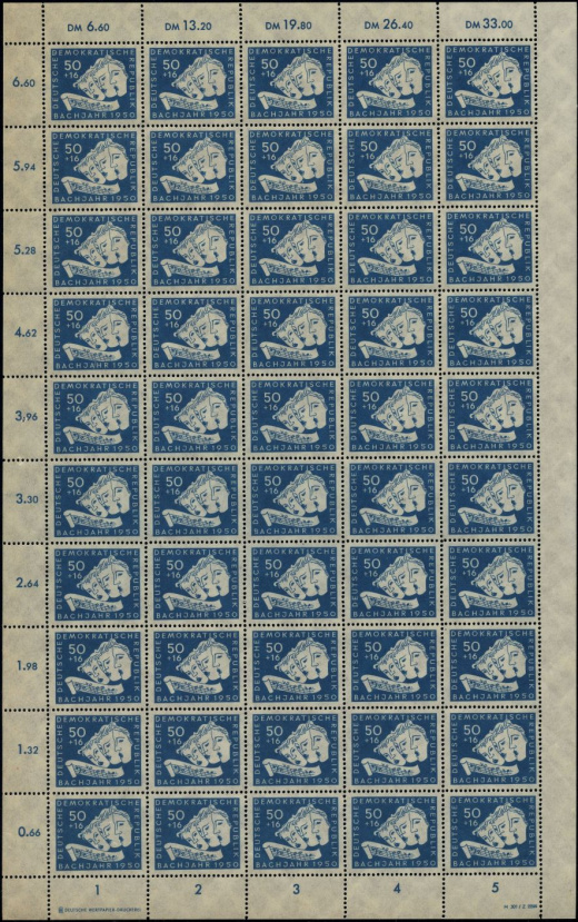 (Zuschlag) | | Ersttag: | 14.6.1950 | | Abbildung: | Portrait von Johann Sebastian Bach | | Zähnung: | K13:13,5 | | Druck: | Odr. | | Farbe: | bräunlichrot | | Wz: | 1 (Kreuzblumen)