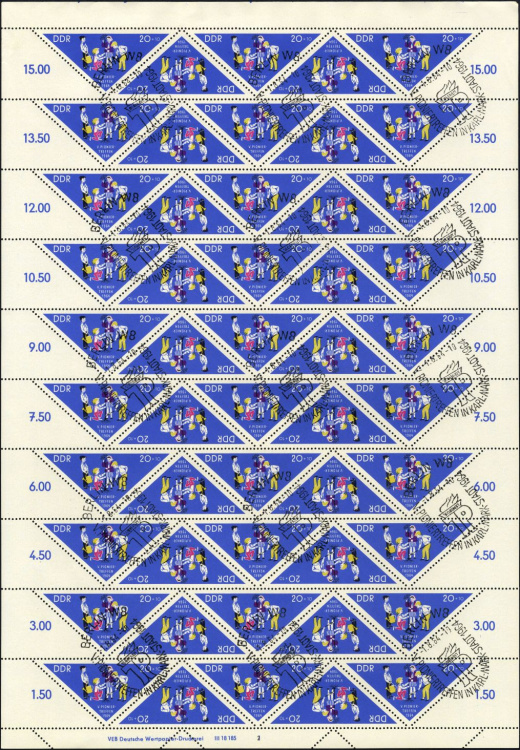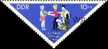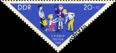 (Zuschlag) | Ersttag: | 29.7.1964 | Abbildung: | Junge Pioniere beim Ballspiel | Zähnung: | K13,5:13 | Druck: | Odr. | Farbe: | mehrfarbig | Wz: | 3X (DDR Kreuzblüten)