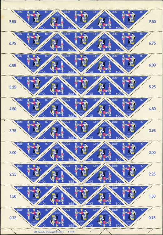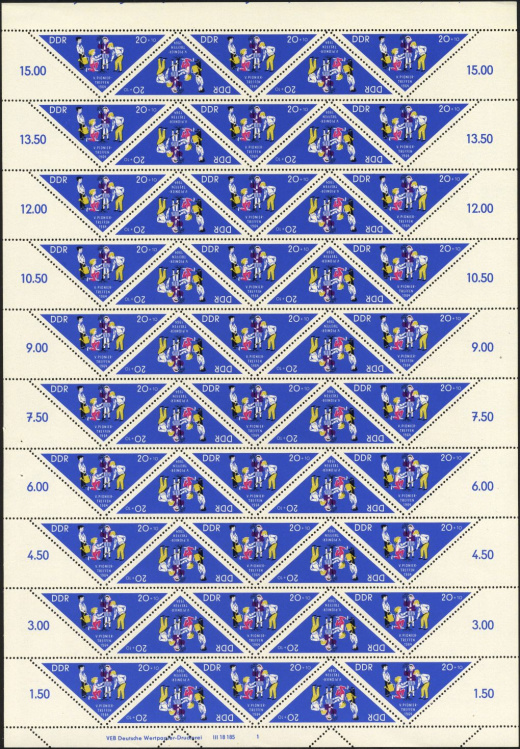 (Zuschlag) | Ersttag: | 29.7.1964 | Abbildung: | Junge Pioniere beim Ballspiel | Zähnung: | K13,5:13 | Druck: | Odr. | Farbe: | mehrfarbig | Wz: | 3X (DDR Kreuzblüten)