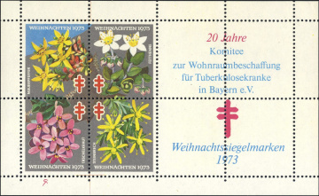 Rechts: 20 Jahre Komitee zu Wohnraumbeschaffung für Tuberkulosekranke in Bayern e.V., Weihnachtssiegelmarken 1973