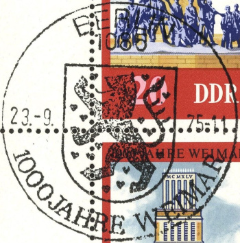 | Nummer: | | SE-10 | | Typ: | Ersttagssonderstempel (ESST) | | Ort/PA: | BERLIN 1085 | | Inschrift: | 1000 JAHRE WEIMAR | | Abbildung: | Wappen von Weimar | | Datum: | 23.-9.75-10 | | Größe: | 40,4mm |