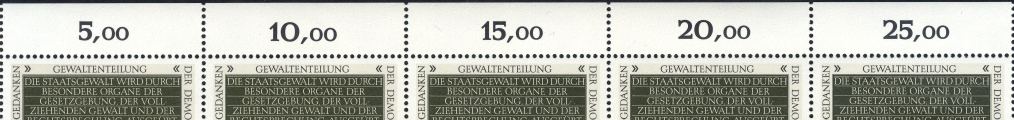 | | Ersttag: | 13.8.1981 | | Abbildung: | Artikel 20 des Grundgesetzes; Volkssouveränität | | Zähnung: | K14 | | Druck: | Odr. | | Farbe: | mehrfarbig | | Wz: | ohne | | Auflage: | 35.500.000 |