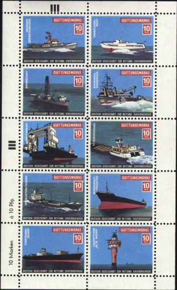 Markeninschrift oben: Quittungsmarke 10Pfg Markeninschrift unten: Deutsche Gesellschaft zur Rettung Schiffbrüchiger Randinschrift links: 10 Marken à 10 Pfg.