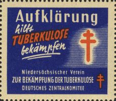 | KatNr.:  |   | DE-1951-3 (Erler: R181, Green: 43.3) |  | Abbildung:   |  Doppelkreuz |  | Schriftzug:  |  "Aufklärung hilft TUBERKULOSE bekämpfen". |  | Zähnung:     |  L10,5 |  | Druck:       |  Odr. |  | Farben:      |  blau, rot |  | Bogen:       |  DE-1951-Bg1 |  | Felder:      |  10, 14, 18, 22 und 26 |
