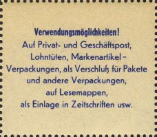 | KatNr.:  |   | DE-1951-ZfT2 |  | Schriftzug:  |  "Verwendungsmöglichkeiten! ...". |  | Zähnung:     |  L10,5 |  | Druck:       |  Odr. |  | Farben:      |  blau |  | Bogen:       |  DE-1951-Bg1 |  | Feld:        |  3 |