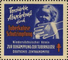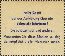 | KatNr.:  |   | DE-1951-1 (Erler: R179, Green: 43.1) |  | Abbildung:   |  Kind hinter Phantomhand |  | Schriftzug:  |  "Verstärkte Abwehrkraft durch Tuberkulose Schutzimpfung". |  | Zähnung:     |  L10,5 |  | Druck:       |  Odr. |  | Farben:      |  blau, rot |  | Bogen:       |  DE-1951-Bg1 |  | Felder:      |  4 - 8 |