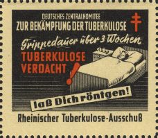 | KatNr.:  |   | DE-1951-13 (Erler: -, Green: 48.3) |  | Abbildung:   |  Patient im Bett |  | Schriftzug:  |  "Grippedauer über drei Wochen, TUBERKULOSE VERDACHT! laß Dich röntgen!". |  | Zähnung:     |  L10,5 |  | Druck:       |  Odr. |  | Farben:      |  schwarz, rot |  | Bogen:       |  DE-1951-Bg3 |  | Felder:      |  2, 7, 10, 14 und 18 |