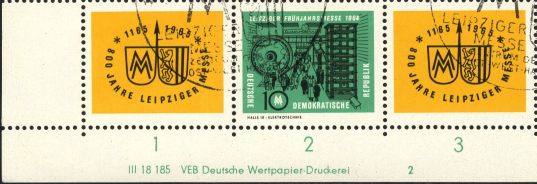 | KatNr.: | | 1012Zf | | Ersttag: | 26.2.1964 | | Abbildung: | Messe-Emblem, Stadtwappen von Leipzig. | | Schriftzug: | * 1165 1965 * 800 Jahre Leipziger Messe | | Zähnung: | K13:13,5 | | Druck: | Odr. | | Farbe: | gelb/schwarz | | Wz: | 3X (DDR Kreuzblüten)