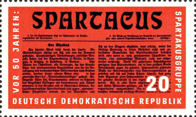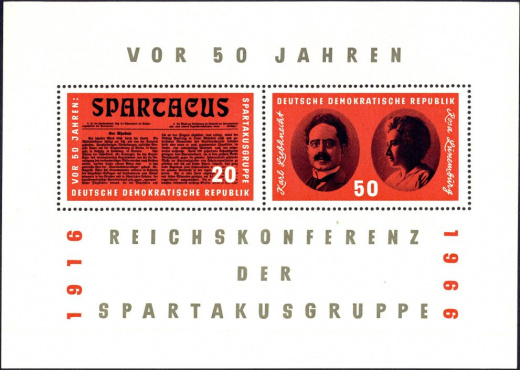 | | Ersttag: | 3.1.1966 | | Abbildung: | Karl Liebknecht (1871-1919) und Rosa Luxemburg (1871-1919) | | Zähnung: | Ks14 | | Druck: | RaTdr. | | Farbe: | dunkelrosarot/schwarz | | Wz: | ohne | | Auflage: | 2.000.000 |