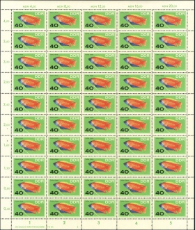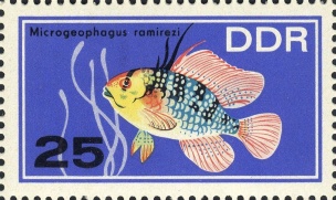 | | Ersttag: | 8.11.1966 | | Abbildung: | Schmetterlings- buntbarsch | | Zähnung: | K13:12,5 | | Druck: | Odr. | | Farbe: | mehrfarbig | | Auflage: | 4.000.000 |