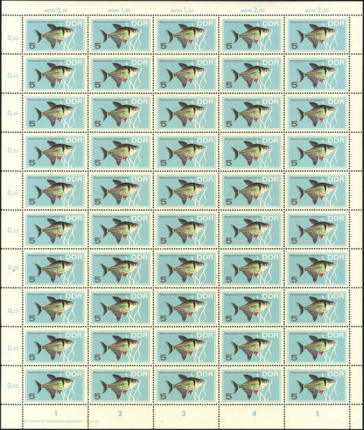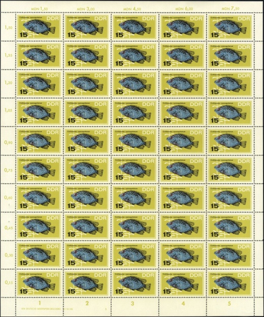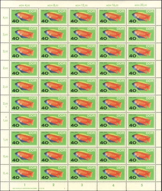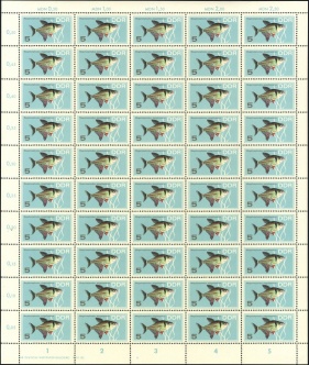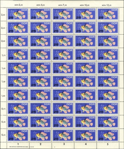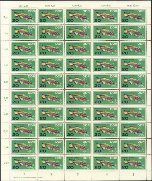 | | Ersttag: | 8.11.1966 | | Abbildung: | Perlbuntbarsch | | Zähnung: | K13:12,5 | | Druck: | Odr. | | Farbe: | mehrfarbig | | Auflage: | 1.500.000 |