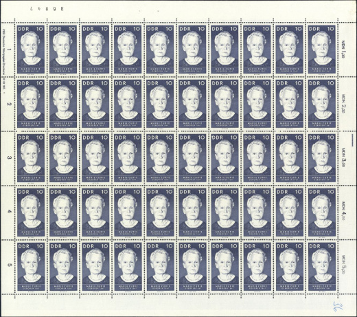 | Ersttag: | 6.7.1967 | Abbildung: | Marie Curie (1867-1934) | Zähnung: | K14 | Druck: | StTdr. | Farbe: | schwarzgraublau | Wz: | ohne | Auflage: | 8.000.000 |