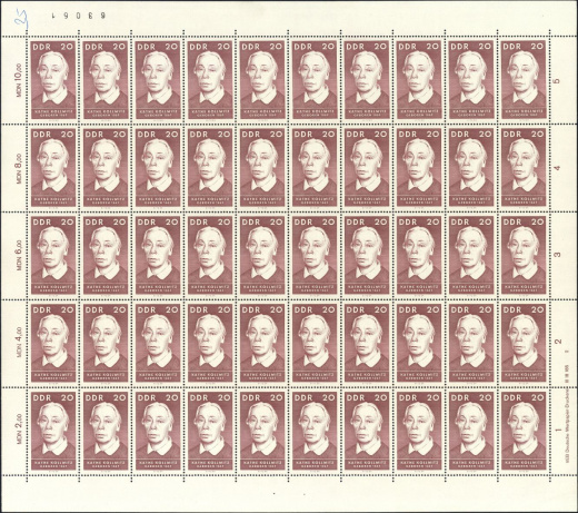 | Ersttag: | 6.7.1967 | Abbildung: | Käthe Kollwitz (1867-1945) | Zähnung: | K14 | Druck: | StTdr. | Farbe: | karminbraun | Wz: | ohne | Auflage: | 8.000.000 |